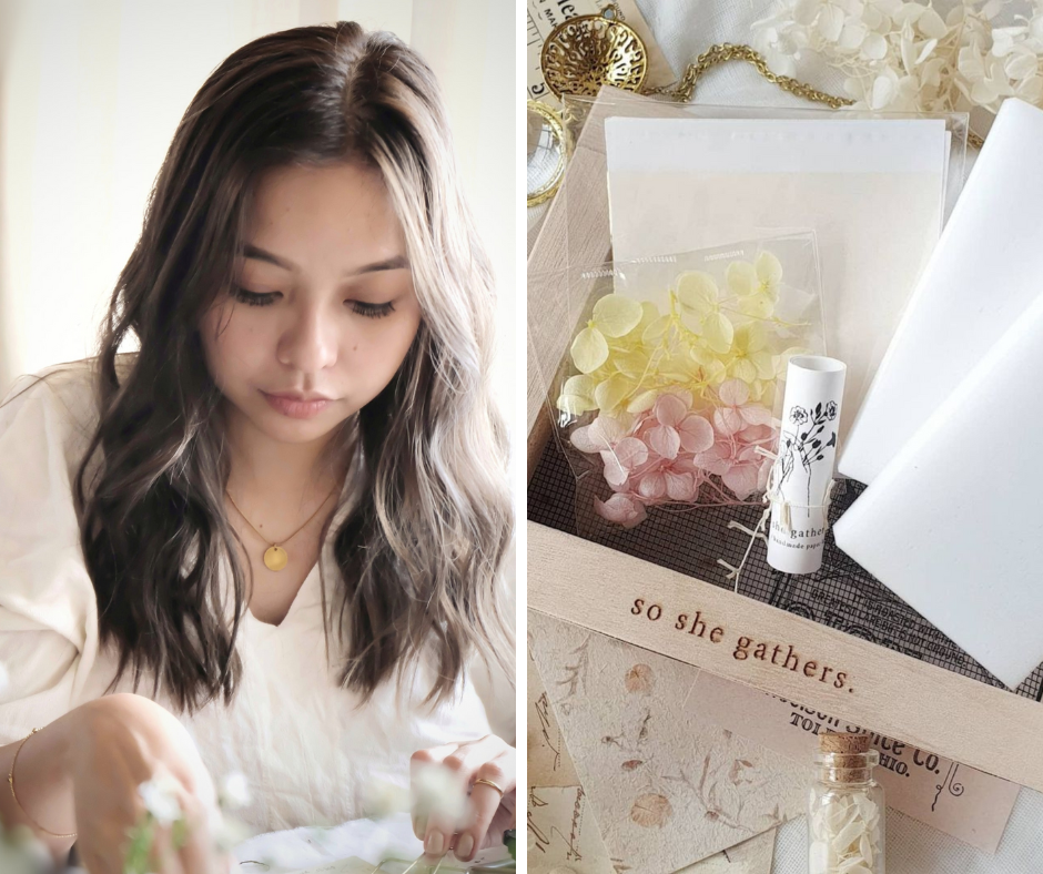 Online entrepreneur and content creator Sharmane Coquilla creatively curating her paper making kits for her online shop So She Gathers (www.soshegathers.carrd.co and soshegathers on Instagram)